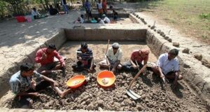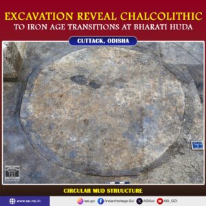 Excavations at Bharati Huda, located in Jalarpur village of Cuttack, Odisha, have revealed the remains of an organized rural settlement dating to approximately 3500–4000 years before present. Findings include circular mud structures, diverse ceramic traditions, stone and bone tools, metal objects, and extensive faunal remains. Evidence of cultivated rice and mung (gram), along with animal and fish remains, indicates a subsistence economy based on farming, stock raising, hunting, and fishing, offering valuable insights into early settlement patterns and everyday lifeways in the proto-historic period of coastal Odisha. Bharati Huda, in Cuttack, Odisha, is a significant archaeological mound situated between the Prachi River and the Tanala rivulet – a location that underscores its strategic importance for early human habitation. The proximity to these water sources would have provided essential resources, making it an ideal site for prehistoric settlement. Excavations conducted during the 2017–18 season revealed compelling evidence of early occupation. Among the most notable discoveries were the remains of circular mud huts and structural platforms, indicating a well-organized and possibly long-term settlement. A diverse array of artifacts was recovered, including ground stone tools, bone implements, copper objects, semi-precious stones, terracotta bull figurines, and terracotta wheels. The site’s ceramic assemblage is particularly varied, comprising red ware, red slipped ware, chocolate slip, tan-red ware, grey ware, black ware, and black-and-red ware – highlighting both technological sophistication and cultural diversity. These findings provide valuable insights into the Chalcolithic and early Iron Age phases of the region, shedding light on prehistoric technologies, settlement patterns, and socio-economic practices. — ASI