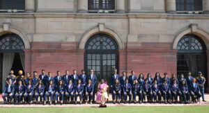 The President of India, Smt Droupadi Murmu in a group photograph with the Members of the Indian Women Cricket team at Rashtrapati Bhavan, in New Delhi on November 06, 2025.