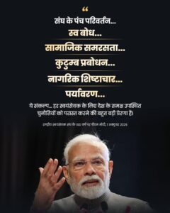 “The Rashtriya Swayamsevak Sangh’s five transformative resolutions—self-awareness, social harmony, family enlightenment, civic discipline, and environmental consciousness—are vital instruments that will enhance the nation’s strength, help India confront diverse challenges, and serve as foundational pillars for building a developed India by 2047”, exclaimed the Prime Minister.