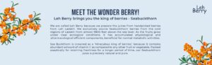Sea buckthorn berry endures the harshest of climatic conditions namely scorching heat, strong winds, and heavy snowfall and sun radiation. Ironically, it is braving these extreme weather conditions that help lock-in an array of powerful nutrients. For just like the “survival of the fittest” Darwinism, these berries pack-in a punch to survive the harshest of conditions. This is why locals call it the “Holy Fruit”.