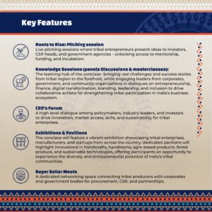 - Roots to Rise (Pitching Session): A unique platform for tribal entrepreneurs to pitch their business ideas to investors, CSR leaders, and government institutions for mentorship, funding, and incubation.