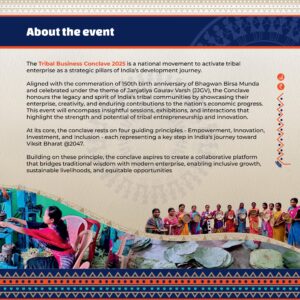 The Tribal Business Conclave 2025 seeks to mainstream tribal entrepreneurship, expand branding and market access for indigenous products, and build capacities for sustainable enterprise development. It will catalyze smoother access to finance, strengthen market linkages, and open investment avenues for tribal communities.
