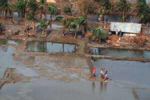 A damaged village in Bangladesh, surrounded by flooded fields, three weeks after the storm had struck | Image: Wikipedia